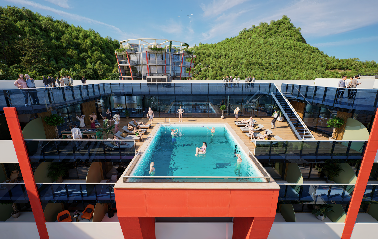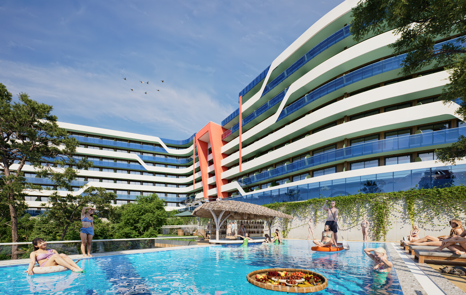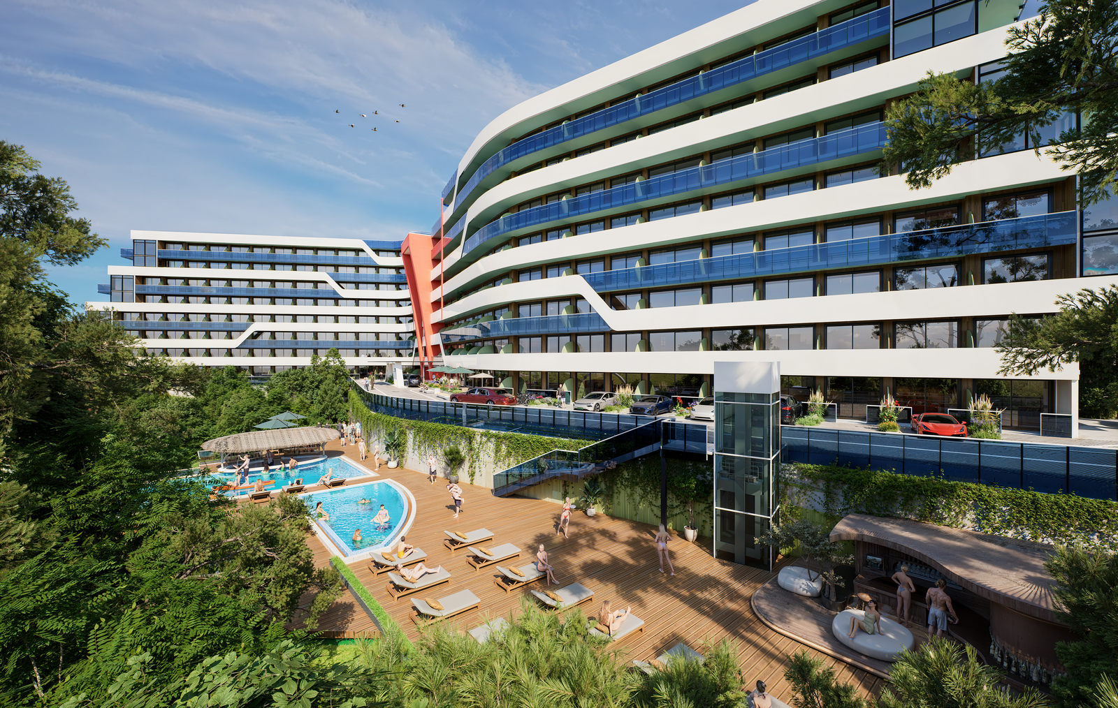 დასვენებისთვის გათვალისწინებულია ღია აუზის ზონა, რომელიც მოიცავს დაახლოებით 200 კვადრატულ მეტრის ფართობის აუზს მოზრდილებისთვის და 60 კვადრატულ მეტრ საბავშვო აუზს. ასევე წარმოდგენილია ღია ტიპის ბარები, რაც უზრუნველყოფს კომფორტულ და მრავალფეროვან დასვენების შესაძლებლობას.